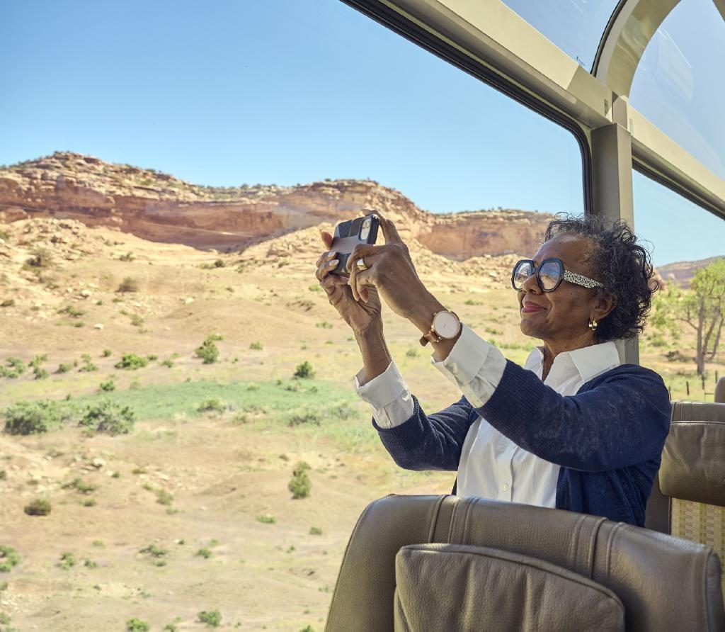 Gaze upon sweeping landscapes through expansive panoramic windows as you relax in spacious seats designed for your utmost comfort, then step out onto an outdoor viewing area and breathe in the fresh air.